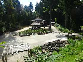 | 神社のある1郭から見下ろす、下の2郭にある寺院。手前に土塁がある。 | 1郭の妙姫庵跡。 |