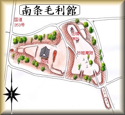 南条の佐橋神社のある比高15mほどの台地が南条毛利館の跡である。とはいえ、城はそれほど大きなものでもなく、目立った遺構があるわけでもない。鎌倉時代に毛利氏が入部して居城としたという場所というにふさわしく、かなり古い時代の城館といった趣の場所である。