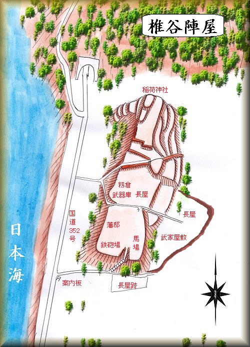 椎谷陣屋は椎谷海浜公園の東側にそびえる比高20mほどの台地上にあり、gooolemapにも掲載されている。