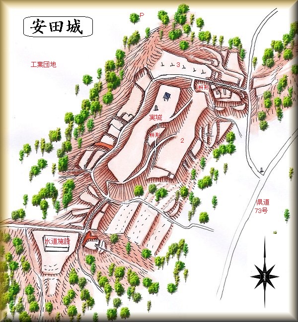 仕方がないので、下から回り込んで二ノ丸周囲のどこかにアクセスしてみようと思ったのだが、山麓には民家が密集していて、なかなか城に近づくことができなかった。また、車を停めるところもない。そんなわけで、実城以外はほとんど探索することができなかった。鳥瞰図は上記の書の図面にかなり頼り切ったものである。