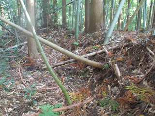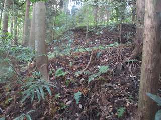 そこから上がって行ったら、横堀状の地形があり、その上が2郭となっていた。横堀状の地形は削り方が新しく見えたので、遺構ではなく近年の工事による所産だと思われる。