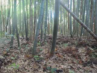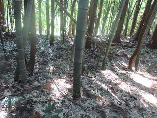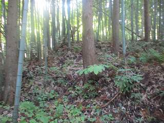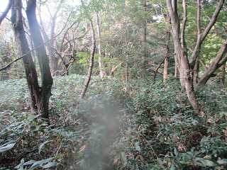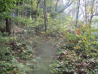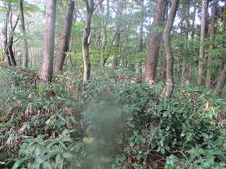 | すぐ上に横堀状の地形があるが、後世の改変のようだ。 | 山頂の1郭方向を見る。ヤブだ・・・。 |