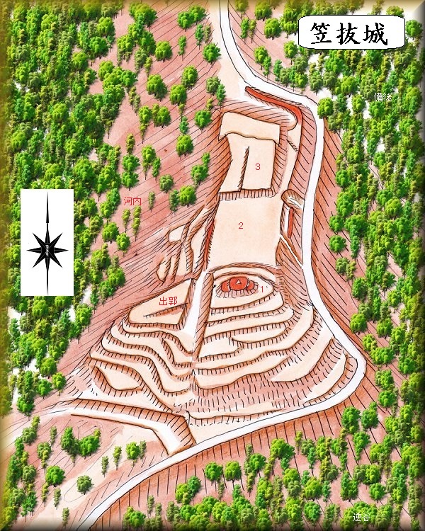 | 笠抜城は、南北朝時代の山城であった。 高畑城の所で述べているように、高畑城主であった橘忠源親子は、宗良親王をこの城に迎え入れて南朝方の拠点としたと言われている。 |