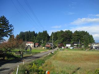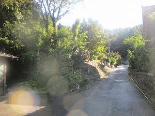 | 集会所の駐車場から民家の間を抜けて北側に進んで行く道。 左側上の山稜が上桐城。 |