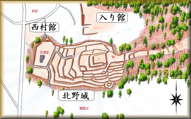 | 北野城は、南北朝時代、南朝方の新田氏の一族であった風間氏・酒匂氏が守っていた城であったという。 後には高尾豊後守定友の居城となった。高尾氏は後に堀之内町の根小屋城に拠点を移していったと言われている。 |