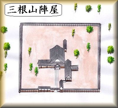 現地案内板には、三根山藩庁の様子を描いた復元図が提示されているので、それを基にして復元図を描いてみたが、陣屋内部がスカスカになってしまっている。実際には藩庁以外の建物がいくつもあったのだと思われるが、具体的な様子は不明である。