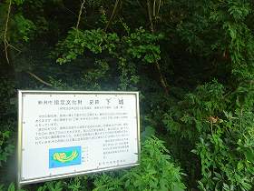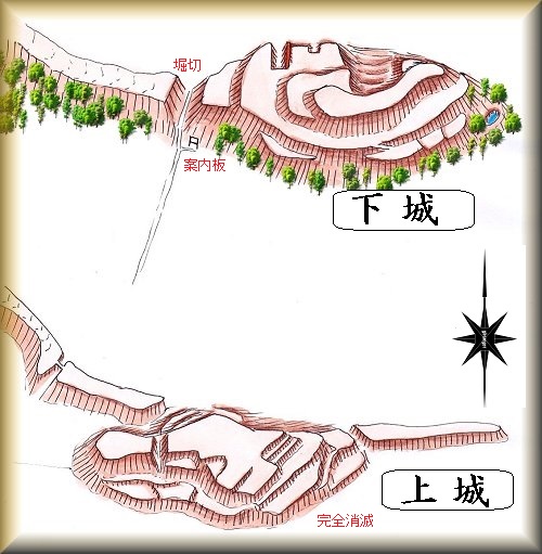 | 上城跡の辺りから遠望する下城。 | 南西側下にある案内板。 |