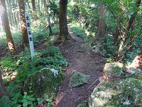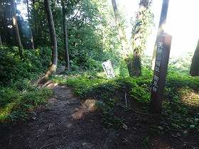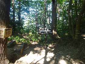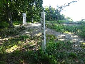 | 大土塁の上にある「土塁・石塁」の標柱。石がごろごろしている。 | その先にある物見台。山麓からの登城道はここに出てくるようだ。 |