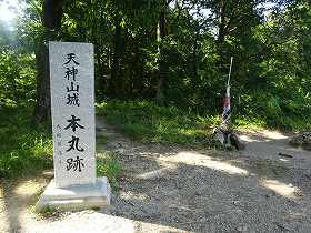 | 本丸の城址碑。右側に朽ちてしまった「天地人」の幟がある。 | 本丸跡の標柱。 |