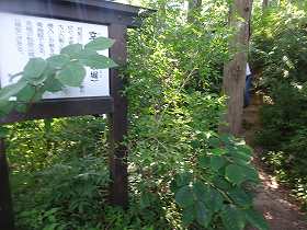 それに対して下城は、そのまま残されているようで、西側の堀切は通路となっており、その南端辺りになにやら白いものが遠目にも見えている。「もしかして案内板があるのでは?」と思って近づいてみたらビンゴ!であった。