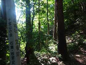 | 石瀬峠からの登り口。案内板が見えている。 | 登ったところが最初の堀切。ここを左手に進むと松茸山城にも行けるらしい。天神山城へは右手の尾根を進んで行く。 |