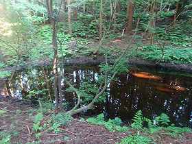 さて、大土塁から北側には鞍部があり、そこに池があるのが見えている。このような山城で池を有しているのはなかなか珍しい。瓢箪池と呼ばれている池だが、籠城の際の水源になっていたものだと思われる。