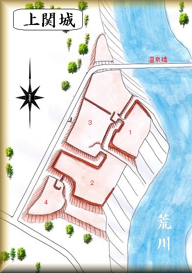上関城は、荒川に架かる温泉橋のすぐ南西側にあり、gooolemapにも掲載されている。荒川の断崖を要害として取り込んだ崖端城であった。