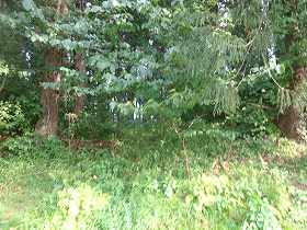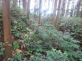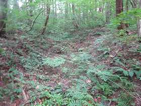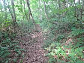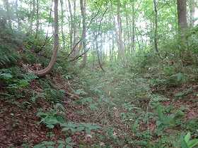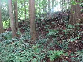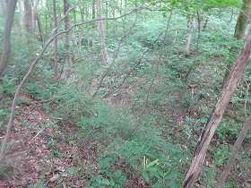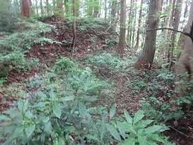 | いきなり深い堀が見えてきたのだが、これは城址の北側にある天然の谷戸部であったようだ。 | 2郭の土塁。堀は認められない。 |