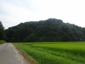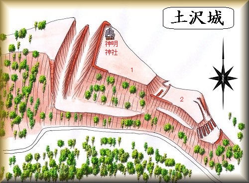 土沢城は、土沢の集落背後にそびえている比高30mほどの山稜先端部に築かれている。集落の西側背後であり、地形図を見てみると南側を林道が通っているようである。