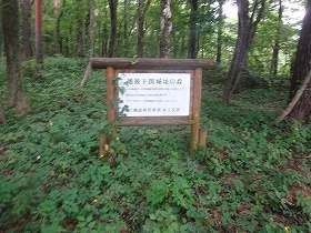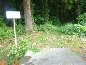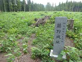 | 1郭に建てられている城址碑。城内の木はすっかり切られていて見通しがよくなっているのだが、代わりに草に覆われてしまっている。 | 1郭南側の土塁と堀。肉眼でははっきり分かるのだが、草が繁茂しすぎていて写真だとよく分からない。 |