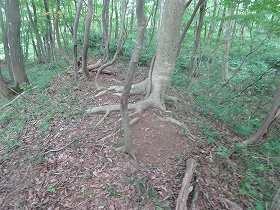 10mほどの切岸であるから、高さはそれほどでもないのだが、急峻な土手となっており、木に掴まりながら何とか登って行く。