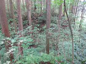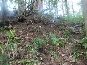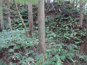 | 1郭下側の横堀。 | 1郭南側の土塁と堀。右下が堀切である。 |