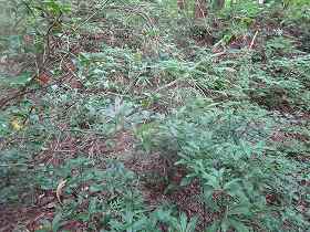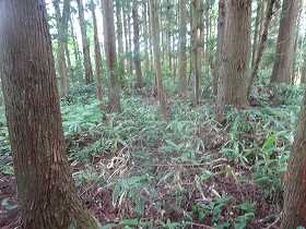 | 2郭内部。ヤブである。 | 1郭の城塁。手前には二重堀切がある。 |