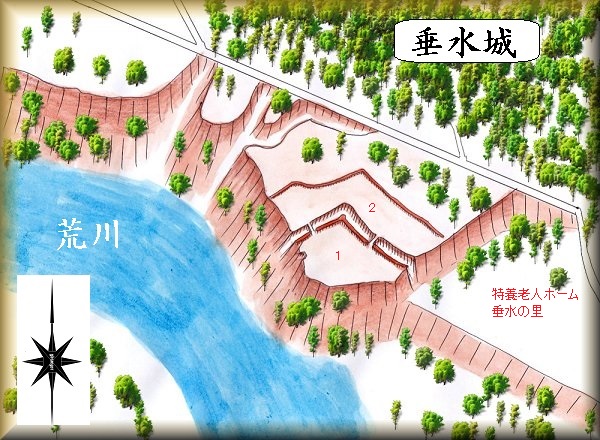垂水城は、特別養護老人ホーム垂水の里の北西にある比高20mほどの河岸段丘上に築かれていた。対岸にある上関城と同様に、荒川に臨む断崖を利用した崖端城である。