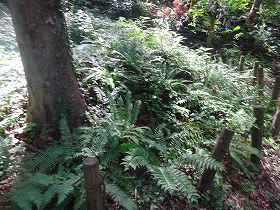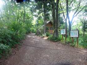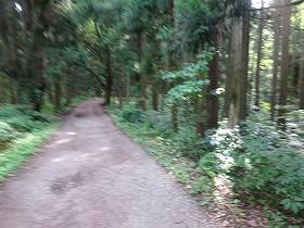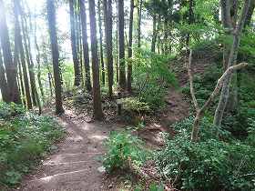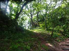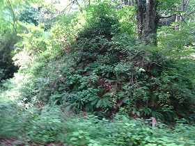 | ここで道は2つに分かれていく。どちらからでも山頂に行けるのだが、左側はアジサイ茶屋への道として付けられた車道であろう。 | 途中にあった蔀石塁。とはいえ、高さは50cmほどであり、とても蔀になったとは思われない。 |