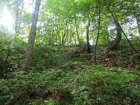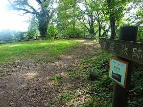 | その先にある堀切。看板も立てられている。 | その先の4の平場。城内で最も広い部分である。 |
