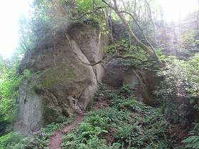 本丸への道は、途中いくつもの段郭の脇を経由していくが、それほどまとまった広さの郭はない。そのうち「蔀石垣」という案内板が立てられているのが目に入ってくる。背後を見てみると、表面に石を貼り付けた高さ50cmほどの土塁状のものが見えていた。これのことであろうか。ただし、高さが50cmほどしかないので、実際に蔀として使用できるかどうかは疑問である。また、その先には巨大な岩も見えている。この山にはあちこちに岩場も存在しているようである。