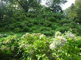 | 1郭城塁を振り返ると斜面すべてにアジサイが植えられていた。シーズンにはアジサイで斜面が埋め尽くされるのであろう。 | その下の郭に建てられている休憩施設。 |