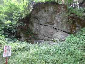 トイレから降って行くと、土塁囲みの大きな空間があり、その先に大岩が見えていた。岩の前には「石切り場」という案内板が設置されていたので、ここから石材を算出していたであろうことが想像されるのであった。