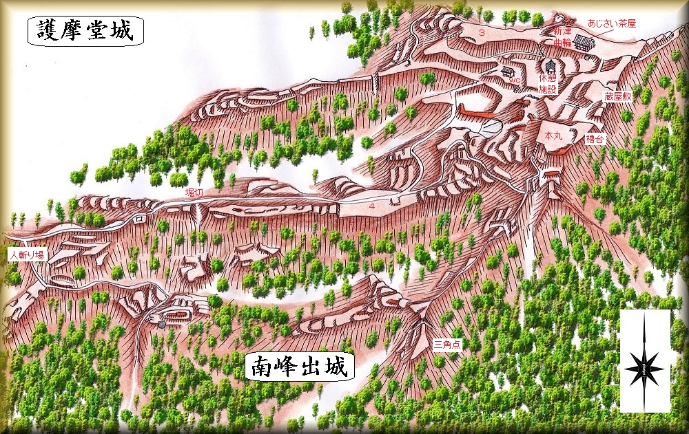 このように護摩堂城は、山稜を幅広く開拓した大規模城郭であり、多数の人員を籠城できるだけの規模の山城であった。かなり大きな勢力によって、時間をかけて築かれた城郭であったものだろう。
