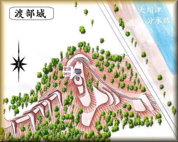渡部城は、菅原神社の建てられている比高60mほどの山稜に築かれている。大川津分水路に面した独立山稜である。