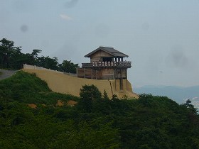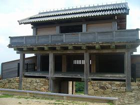 | 西方から遠望した西門。まるで模型のように見えるが、実際はとにかくでかい櫓門である。 | 西門に向う途中にある角楼。これも妙にでかい。石垣の間を柱が通っているのが珍しい。櫓部分が復元されていないのは、正確な考証ができなかったせいであろうか。 |