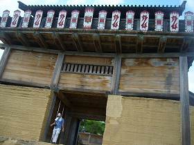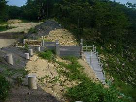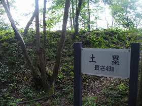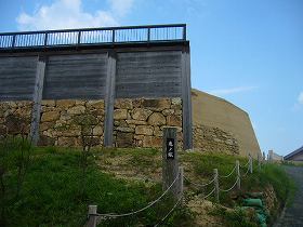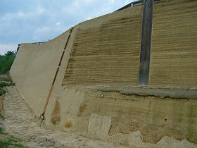 | 西門脇は、石垣ではなく版築の土塁で固めてあった。古代中国の城壁のようでもある。土塁といってもこれだけしっかり固めてあれば、石垣に匹敵する防御力を発揮するであろう。 | もう一度、後ろ側から西門を見たところ。 |