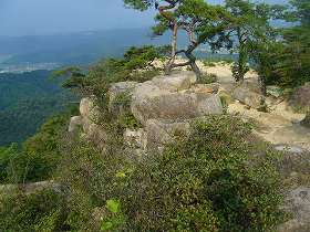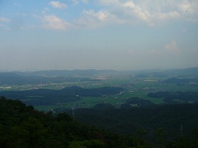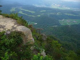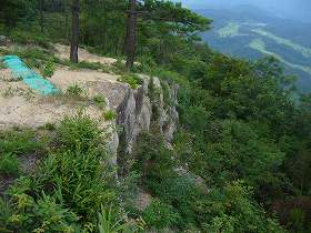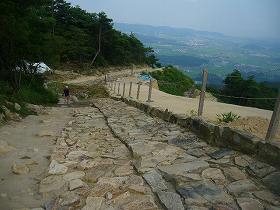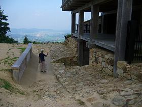| 南門に向う途中の高石垣。ちゃんとした石垣である。このような石垣が千数百年も崩れずに残っているというのもすごいことで、それだけちゃんとした記述で積まれているということでもある。 | 南門付近から、山麓部を見たところ。とにかく眺望はとてもよい。下が急斜面なので、縁部に立つのが怖いほどである。 |