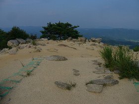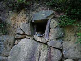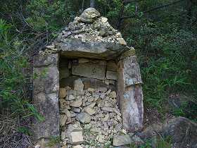 | 西門から石畳の通路を通って南門の方に向かっていく。城塁は、山頂に沿ってではなく、少し降った斜面部に沿って築かれているという点が、中近世の城郭とは異なっている。 | 途中の何箇所かには、このような石の祠のようなものがあった。これも古代信仰にちなんだものなのだろうか。 |