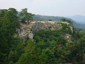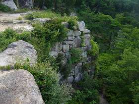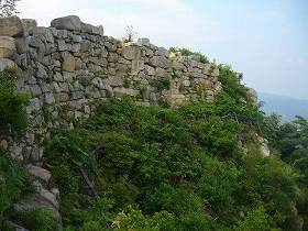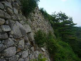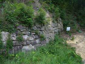 | 南門跡。これも枡形を伴った埋門形式の門であったようである。 | 南門からさらに進んだ所にある高石垣。石垣の下も急峻な岩場である。 |