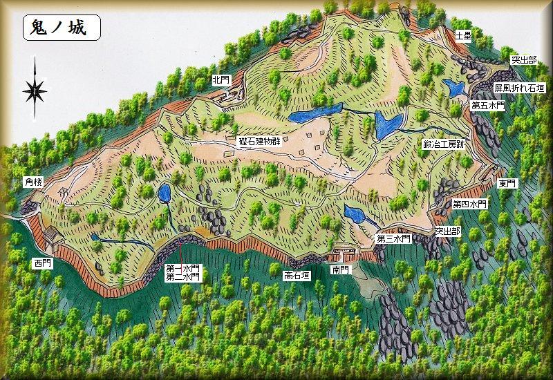| 鬼ノ城に関する記録はない。しかし、この遺構の規模と状態から、古代山城の1つであったことは間違いないと思われる。この城には巨石が多く散らばっており、石垣の構築にもこうした天然の石材が役に立っている。このような巨石をもちいた雄大な構造を見た後世の人が、「鬼の城であったにちがいない」という印象を持ち、それがこの城の名称となったものであろう。 660年、朝鮮半島には新羅、百済、高句麗といった国家があったが、このうちの新羅は唐と結んで強大となり、百済を攻撃して滅ぼした。百済と親交のあった大和朝廷は、百済救援のため、大軍を朝鮮半島に送り込んだ。663年、百済・大和朝廷の軍勢は白村江で、唐・新羅連合軍と決戦を行った。いわゆる白村江の戦いである。この戦いで大和軍は大敗し、日本に逃げ帰り、百済は滅亡してしまうことになる。 日本に帰った大和朝廷軍は、唐・新羅の軍勢の強大さを説き、さらにかの軍勢が日本に攻め寄せてくる可能性をも指摘した。これに危機感を抱いた大和朝廷は、西国の各所に山城を築いて、朝鮮軍の襲来に備えることとなった。鬼ノ城もそうした時代に、国家防衛の要の1つとして築かれた城であると想定されている。 |