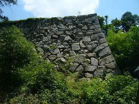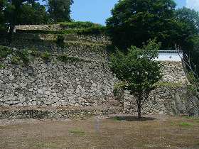 | 三の丸から厩曲輪と二の丸方向を見たところ。こちらも高石垣が印象的である。 | 二の丸下の石垣には、折れ部分を埋めるように積み上げた石垣があった。これは本来のものであろうか。どうしてこのように積み上げたのかよく分からないが、実に珍しい積み方である。 |