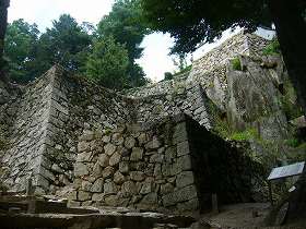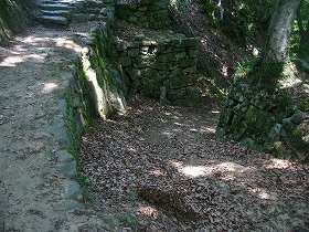 | さらに歩いて行くと、大手の入り口が見えてきた。こんな山奥なのに、石垣が厳重に積み上げられていて、見るからに圧巻である。 | 大手入り口南側の平櫓跡から、大手櫓門跡の枡形方向を見たところ。正面右側は天然の巨大な岩盤の上に石垣が積み上げられている。これではちょっと攻め上れないであろう。 |