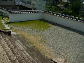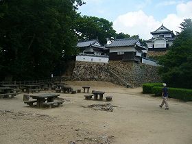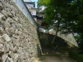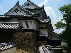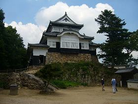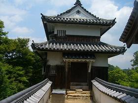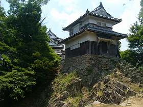 | 本丸から見た天守。二層の小規模な天守ではあるが、派手な派風があったりして、わりと瀟洒な印象を受ける。二層とはいえ、やはり天守というのはスペシャルな建物なのである。ちなみに、本丸では冷たいお茶を無料で飲むことができる。ちょっとしたことだが、真夏ではこれがとてもうれしかったりする。 | 天守の裏側にある二重櫓。城内には平櫓が多く、二層のものは、これと天守くらいなものである。 |