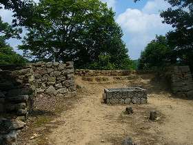 | 裏手に向かう途中にあった搦め手門の枡形。しかし、ここを出ても道らしいものはなかった。崩落してしまったものであろうか。 | 城の北端部にある平櫓跡。手前には井戸もある。この櫓の下の脇に沿って降っていくと、大松山城方向に続く木橋のところに出る。 |