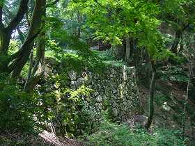 | 再び近世松山城の方に戻ってくる。途中、今度は、相畑の方の道を通ってきた。すると、途中にこのような低い石垣があちこちに見られる。これは中世段階の遺構なのであろうか。 | このように石垣はあちこちに見られる。 |