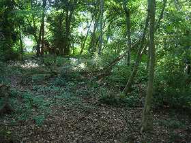 | それをさらに進んでいくと、(あ)の郭と天神の丸との間の堀切のところに出た。ここから天神の丸の側面を通って行った先の山が大松山城ということになる。その途中には岩盤むき出しの部分やアベマキの巨木があった。細い山道のすぐ脇は断崖のような急斜面である。そのすぐ先の「←大松山城」の案内板に従って左手の山に進んでいく。 | 大松山城には1と2の主要な郭があり、その間の部分が緩やかな斜面の谷戸部となっている。写真はその谷戸部から奥の方を見たところ。歩いていても、どこが大松山城なのかよく分からなかったのだが、この谷戸部の入り口に、「大松山城跡」の石碑が建っていたので、かろうじて「ここが大松山城なのか・・・」と分かったのであった。 |