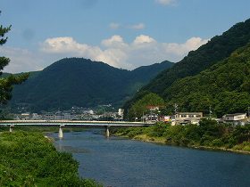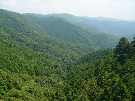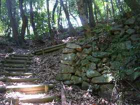 | 吊り橋から見た風景。見渡す限り山、山、山・・・・本当に山しか見えない。これでは絶景とは言い難い。眺望が利いているというわけでもなく、観光客が来るわけでもない。こんなところに吊り橋を造った理由が本当によく分からない。 | 吊り橋の入り口からさらに降りて行った所に番所の跡があった。このようなところまで石垣が積まれているとは・・・・ここまで来る人はめったにいないであろう。しかし、このようなきちんとした石垣が残っている。苦労してきた甲斐があったというものだ。 |