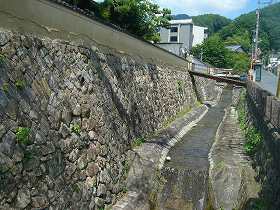 | 根小屋地区の石段のすぐ下にはJR伯備線の線路が通っている。 | 根小屋東側の川。この川沿いにも石垣がしっかりと積まれている。この町にはとにかく石垣が多いのが印象的である。 |