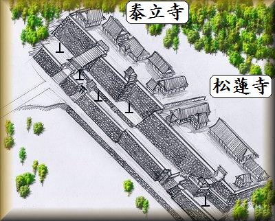 | 下から見た松蓮寺。半端な近世城郭よりもよっぽど城らしい立派な石垣によって守られている。こうしてみると、まったく城にしかみえない。 | 松蓮寺の入り口。参道は折れて枡形のようになっており、途中には櫓台のような構造まである。まさに城である。 |