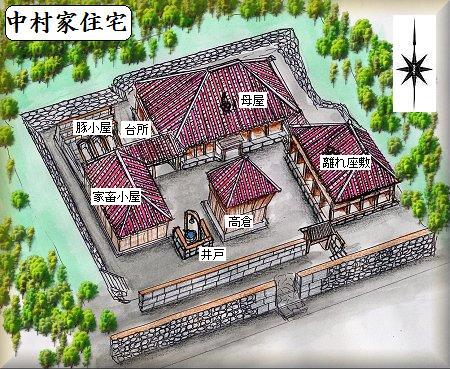 | 中村氏の先祖の賀氏は、護佐丸の師匠であった(とパンフレットに書いてあったが、何の師匠なのかよく分からない)ために、護佐丸が中城に移ってきた際に、共にこの地に移り住んできたという。 護佐丸が阿麻和利の讒言によって攻め滅ぼされると、賀氏の一族も離散の憂き目を見ることになるが、1720年頃、再び貨運を盛り返し、この地の地頭に任じられたという。つまり中村家は18世紀の地頭の屋敷であったということになる。 |