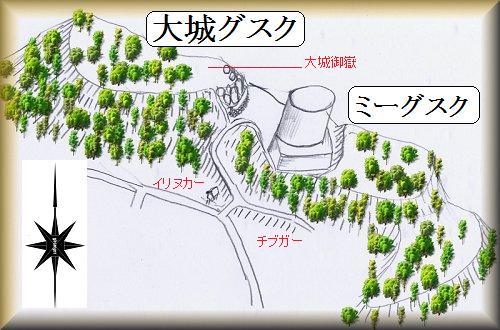 北中城村の大城城のページを見てみると、中央の鞍部を挟んで西側が大城城、東側がミーグスクということで、城域は2つに分かれていたようである。すぐ近くにミーグスクが隣接するというのは大里按司の居城であった大里城と同様である。