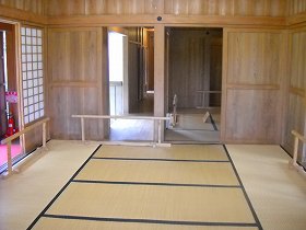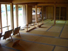 | 南側の築山の上から見た御殿。いい感じだ。 | 御殿内部。畳が敷かれ、和風のイメージである。 |