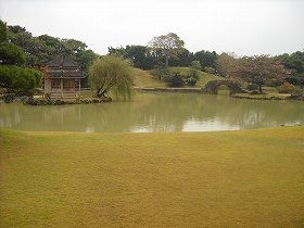 また、池と、そこに架かる橋、六角堂、御殿やあちこちに築かれた築山などの取り合わせはなかなか巧みで、非常に雰囲気のいい庭園となって、訪れる人の目を楽しませている。池を中心とした廻遊式庭園であった。